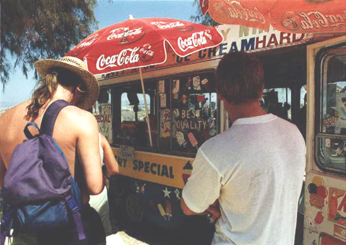 "Oh, you're from England? This ice cream van's from England too. Very good quality!" It does amaze me how very English Cyprus actually seems to be, at least in the towns and more touristy areas where we go. Everybody speaks English. Road signs are in English as well as Cypriot Greek. They have all the English papers and magazines, fish'n'chip shops and McDonald's, even Woolworths. Naturally it has its perfectly valid historical explanations, but it does still seem a shame somehow. The ice cream is really nice, but melts quickly in the sun. |