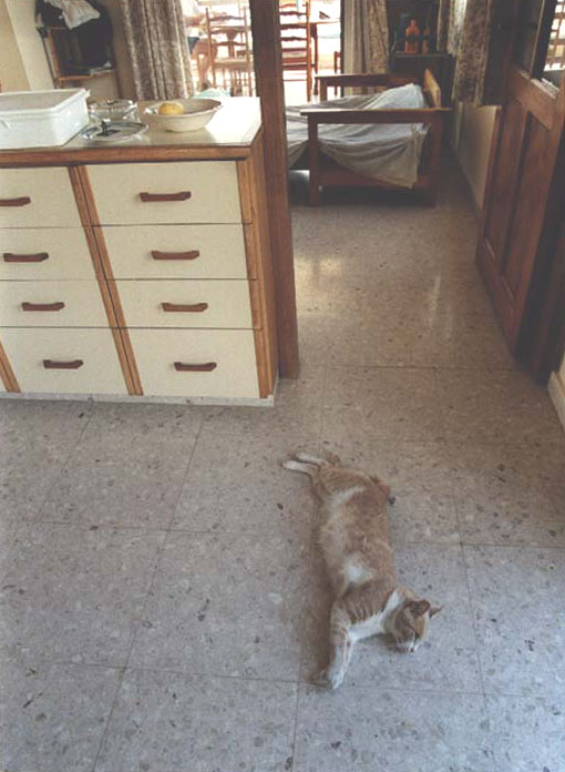 Cats are everywhere in Cyprus. We are adopted by a skinny little thing with a very pretty face, soon enough christened Muppet. After a while she's not so skinny any more - tinned cat food, fresh water and lots of fuss give her healthy meat on her bones. And she makes herself at home very quickly. Before we know it, she has advanced from that jumpy moggy by the backdoor to a princess sharing her time comfortably and equally between the cool kitchen floor and Louise's bed. |